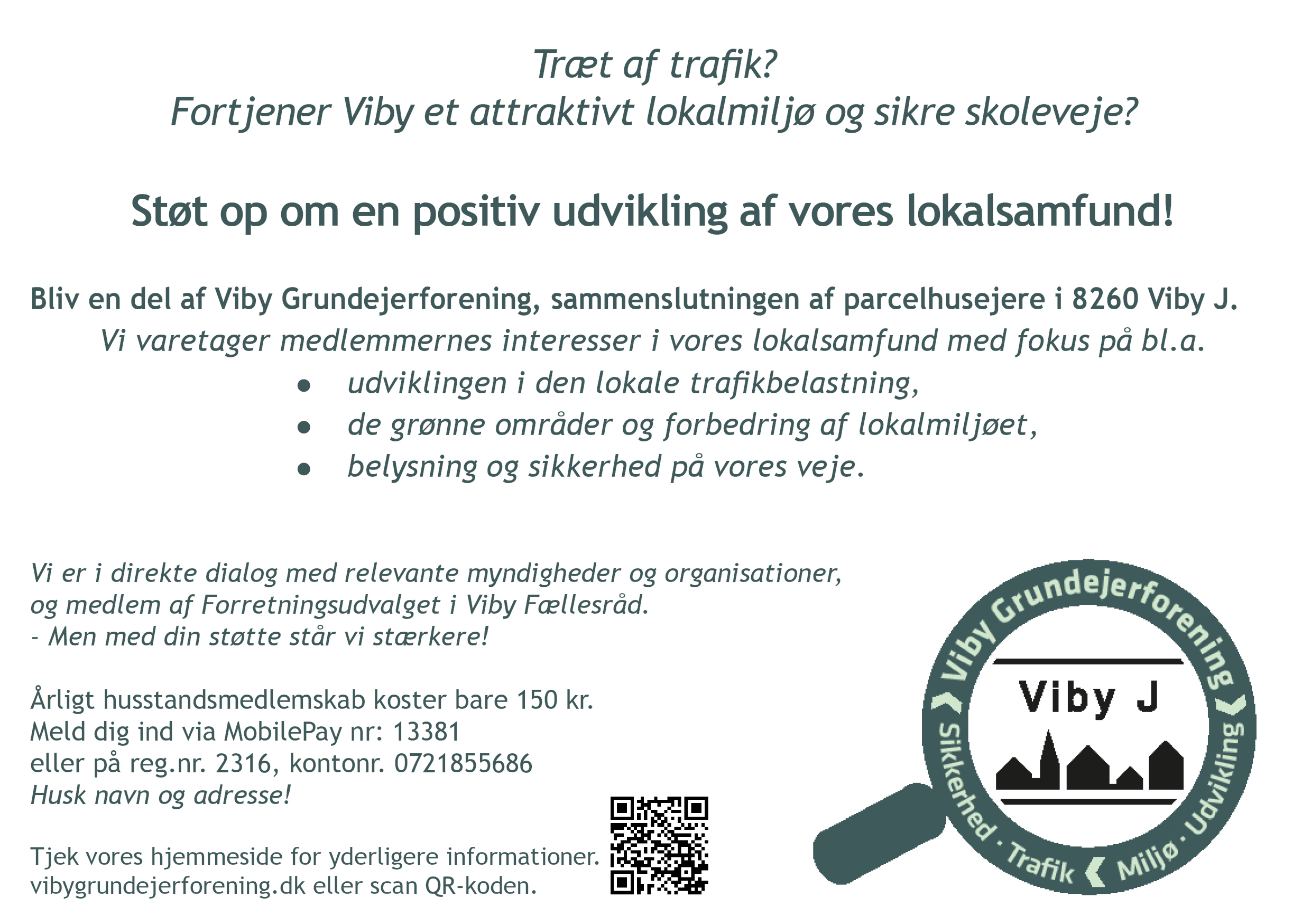 Generelt er vi opmærksomme på den udvikling der sker med bydelen, og forsøger at sikre at 8260 Viby J i fremtiden er et godt og sikkert sted, hvor vi har lyst til at bo med vores familier.